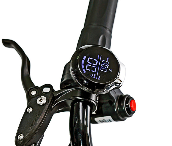 - Handle bar mounted LED gauge with speed, voltage and range and Hi/Low push button